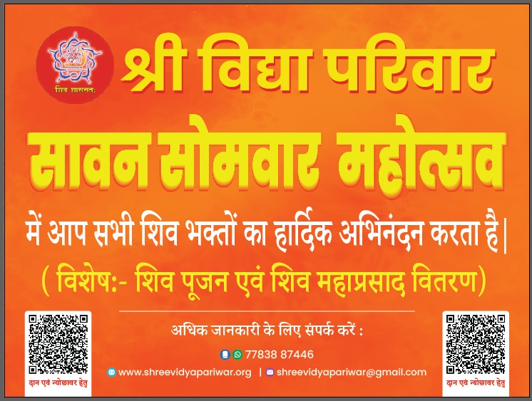 हर वर्ष की भांति इस वर्ष भी श्री विद्या परिवार सावन के पवन महीने के दौरान प्रत्येक सोमवार को विभिन्न शिव मंदिरों में शिव पूजन (रुद्राभिषेक) एवं शिव महाप्रसाद का वितरण करने जा रही है आप सभी शिव साधकों से निवेदन है इस उत्सव में हमारे साथ जुड़े और इस कार्य का भागीदार बने।